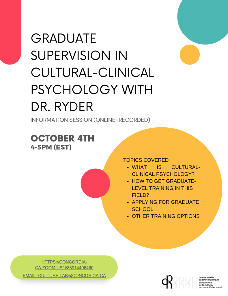 On October 4th (4-5pm EST), Dr. Ryder will be leading an information session entitled “Graduate Supervision in Cultural-Clinical Psychology”. Please find all the details on the flyer.